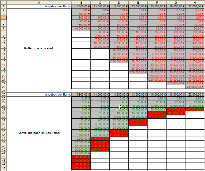 letzten Samstag Beispielsweise waren bei vorhandenen 6 von 26 Koffern, in denen sich noch die Beträge 0,20€, 1€, 20€, 100€, 5000€ und 250.000€ befanden = 17.500€ das Angebot der Bank.