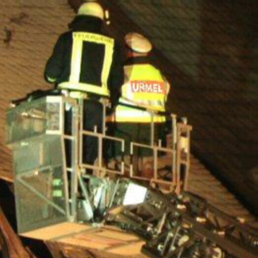 Nicht nur Fahrer und Auto, sondern auch das Gebälk des Daches nahmen dabei erheblichen Schaden. Ein Kran soll nun das Fahrzeug bergen, nachdem der Verletzte bereits mit Spezialgerät auf den Boden geholt worden war.(dpa/nz) Quelle