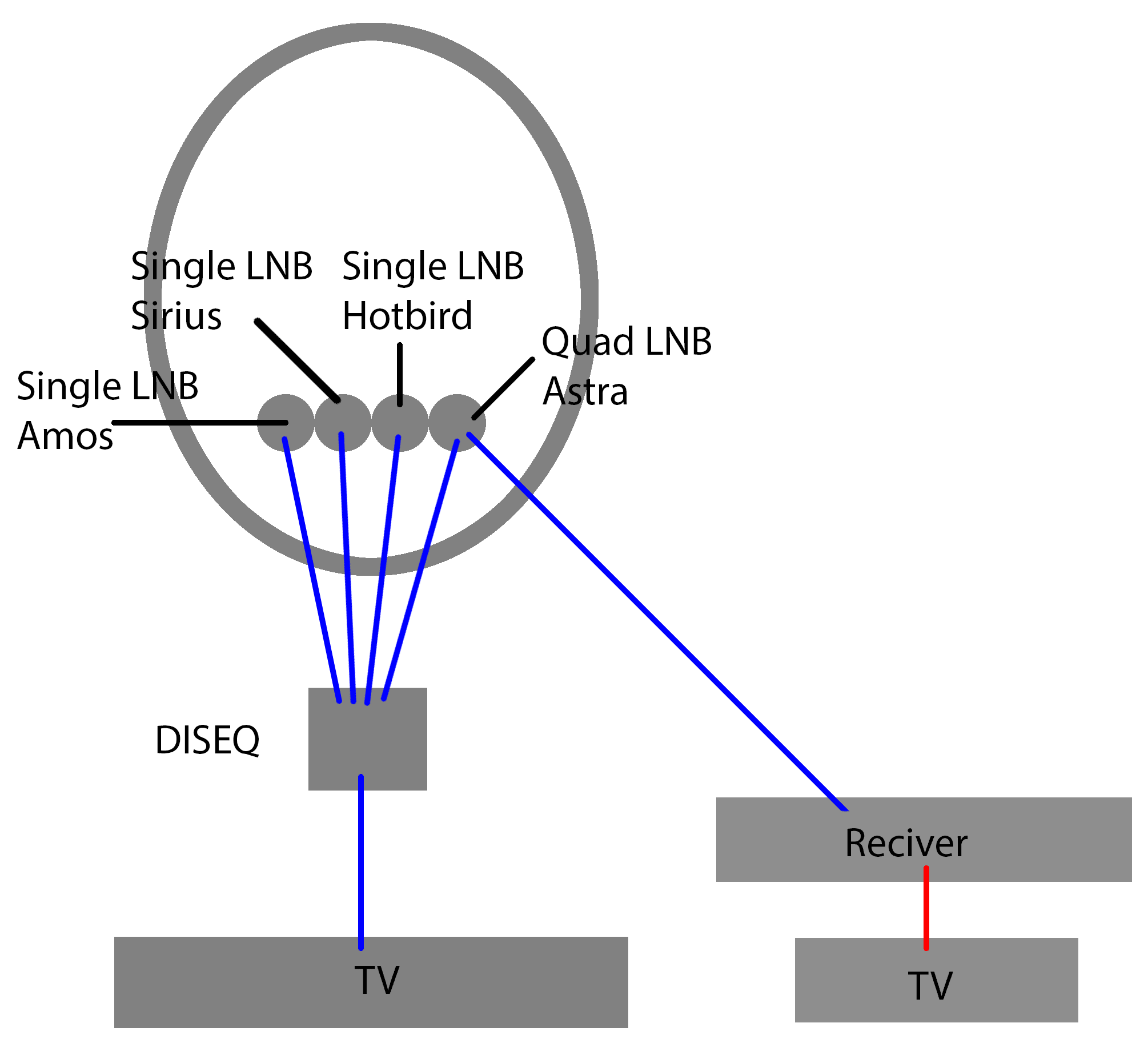 Er hatte zuvor eine Satspiegel mit 4 Single LNB (Astra, Hotbird, Sirius, Amos) die auf ein Diseq und dann in den TV gehen. Dies funktionierte auch nun über die Jahre.
