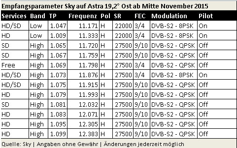 Neue Frequenzbelegung für Sky-Programme auf Astra 19,2° Ost