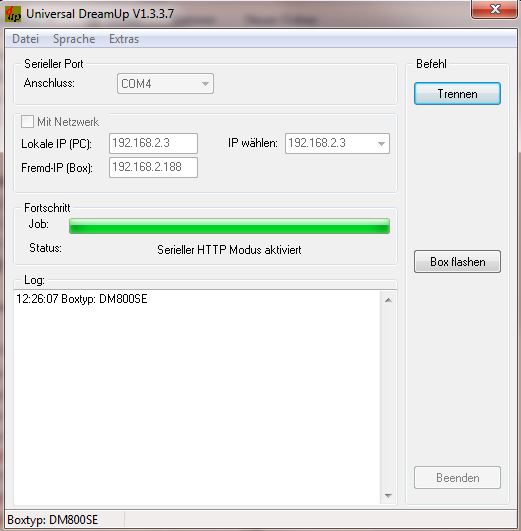Der Dreambox wird nun die IP zugewiesen, im Display erscheint Serieller Modus. Über den Button Box flashen kann nun wie gewohnt das neue Image (oder auch ein anderer Bootloader) aufgespielt werden.