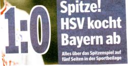Der Hamburger SV bleibt ganz oben: Die Hanseaten gewannen das Traditionsduell gegen Bayern München mit 1:0 (0:0) und liegen nun sechs Punkte vor dem Rekordmeister. Das Tor des Abends erzielte Mladen Petric nach 72 Minuten.