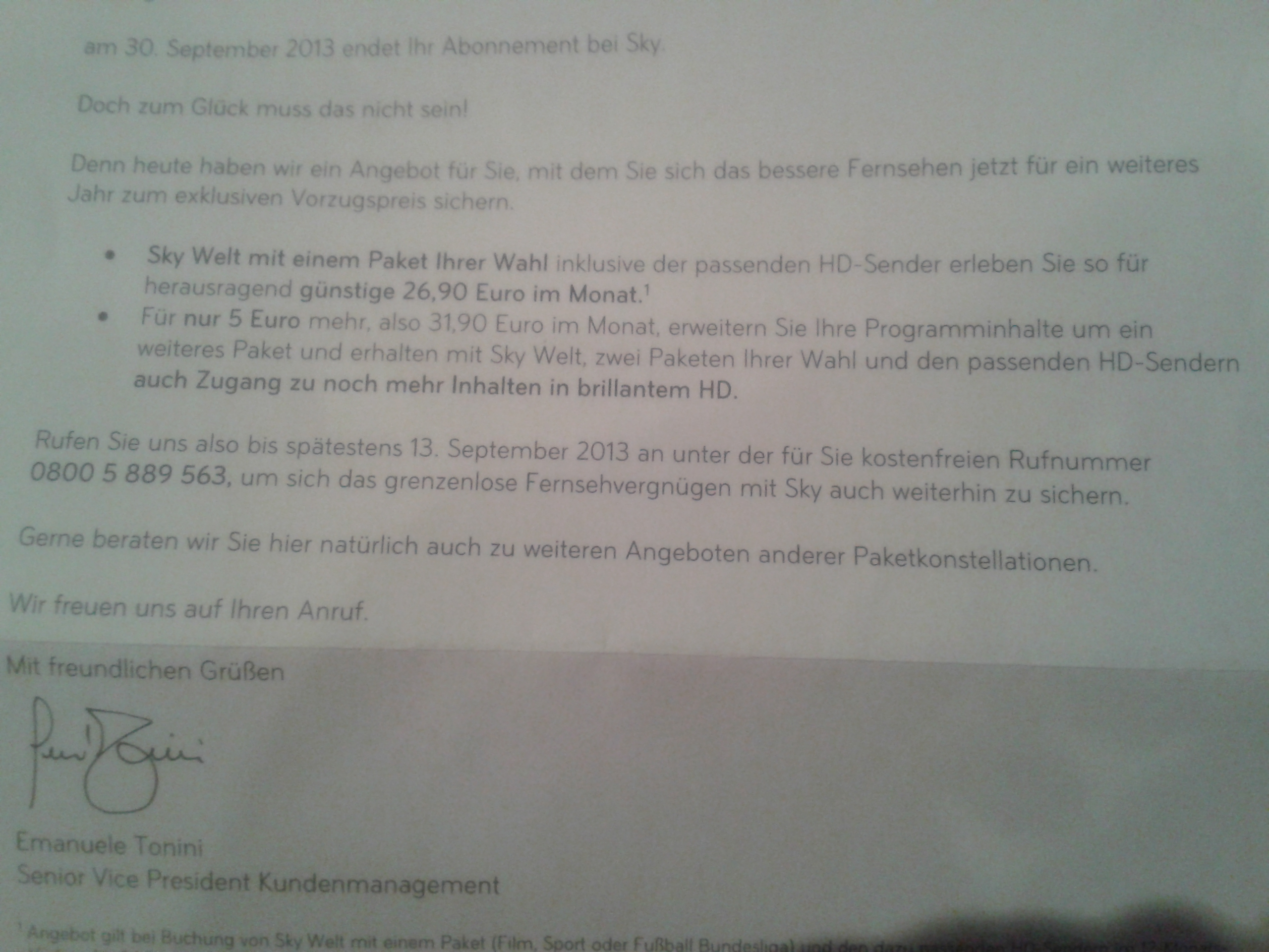 Habe heute erste Post von SKY erhalten, da mein komplett Abo zum 30. September endet.