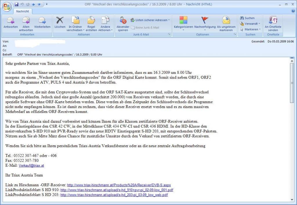 Der ORF wird am 17.03.09. sein Verschlüsselungssystem ändern (anpassen), womit keine illegalen Receiver, Module und Karten mehr funktionieren sollen. Dies wurde in einem Nachbarboard bekannt gegeben, auch schriftlich angeblich vom ORF bestätigt.