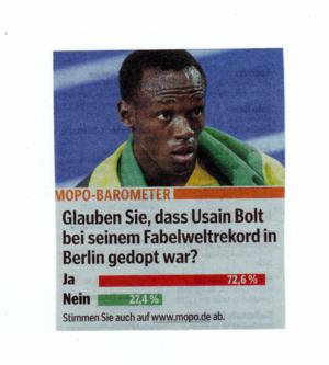 Dass es bei Bolt sogar noch Luft nach unten gibt, ergeben die Werte einer biomechanischen Analyse, die der Weltverband IAAF am Montag vorlegte. Demnach hatte der Jamaikaner am Start mit 0,146 Sekunden nur die sechstschnellste Reaktionszeit aller acht Final-Teilnehmer. Doch bereits nach 20 Metern lag Bolt 2/100 vor seinem später drittplatzierten Landsmann Asafa Powell. Den größten Speed entwickelte er den Daten zufolge zwischen 60 und 80 Metern. Bei 41 Schritten bis zum Ziel erreichte er eine Spitzengeschwindigkeit von 45 Stundenkilometern - nicht schnell genug, um auf den Straßen Berlins geblitzt zu werden.