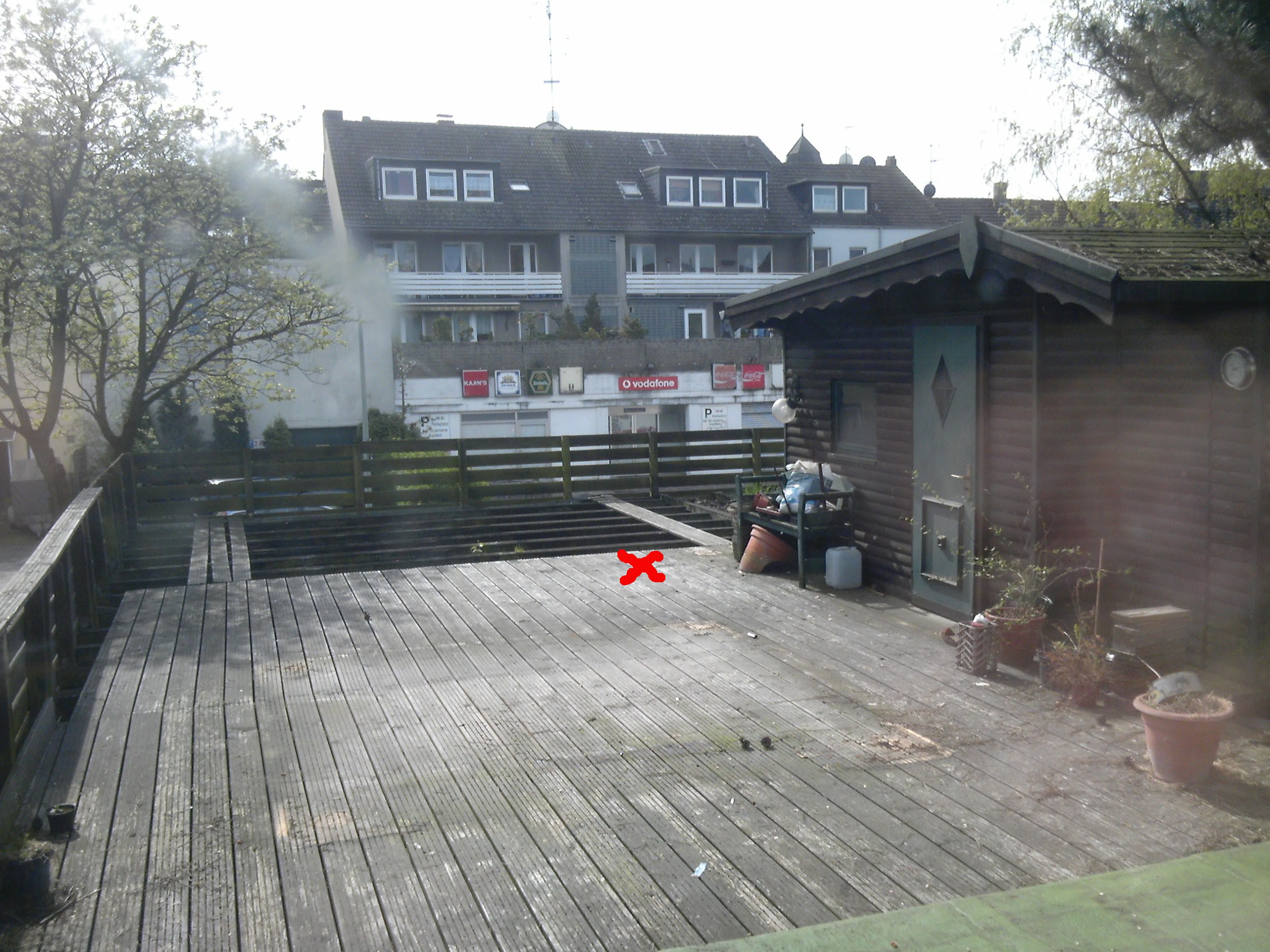 Nur wie sieht es dann mit der Erdung aus? Ich habe mal ein Foto von meiner Terrasse gemacht. Die Sat-Antenne soll auf der rot markierten Stelle stehen.