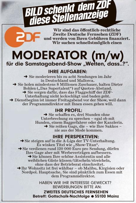 Das Blatt aus dem Springer-Verlag schenkte dem öffentlich-rechtlichen Mainzer Sender am Dienstag eine große Stellenanzeige,