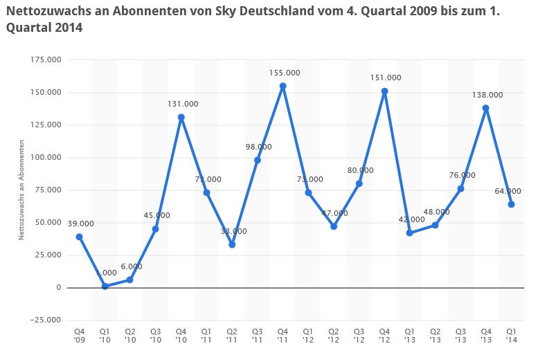 Diese Statistik zeigt den Nettozuwachs an Abonnenten von Sky Deutschland. Im 1. Quartal 2014 konnte der *******-Sender insgesamt 64.000 Abonnenten netto hinzugewinnen. Das sind 22.000 Abonnenten mehr als im Vorjahresquartal.