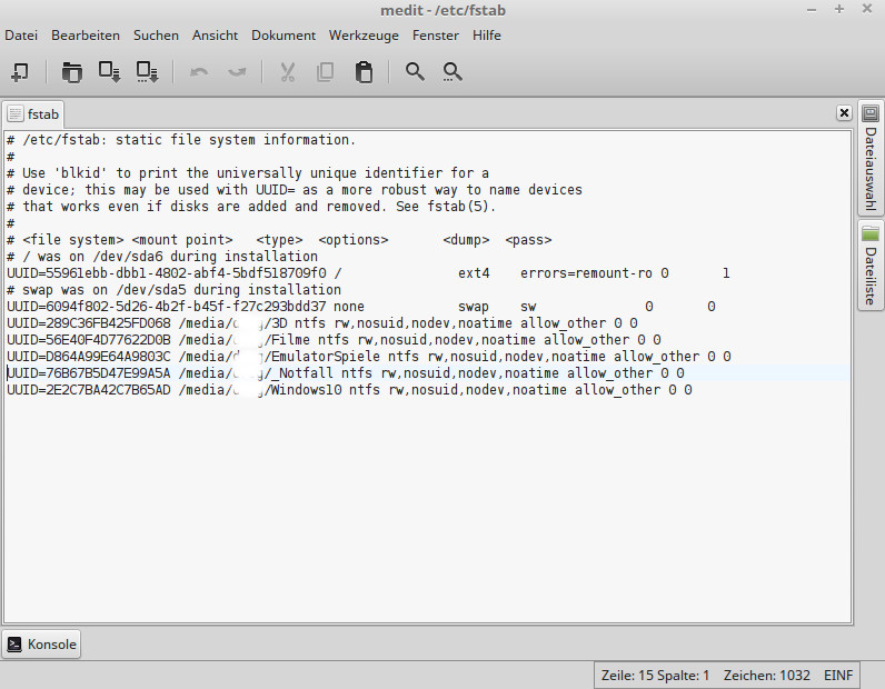 Hier lassen sich dann bequem die Parameter anpassen, bzw. fehlerhafte Einträge entfernen (siehe Abbildung). Der Texteditor medit kann auch durch ein anderes adäquates Tool ersetzt werden, dieser wurde von mir verwendet. So, ich hoffe ich konnte mit diesem kleinen Beitrag vielleicht dem einen oder anderen Nutzer mit einem ähnlich gelagerten Problem helfen. Linux und die Problemlösung oder Installation von Tools hat immer viel mit lesen in diversen Foren zu tun. Das ist oftmals zäh und langwierig, aber es lohnt sich wenn man wieder ein bischen schlauer ist ;)