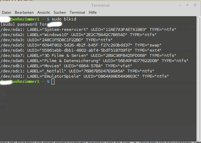 Es erscheinen diverse Infos zu Euren Platten und Partitionen (siehe angehangenes Bild). Diese sind nützlich um zu ermitteln, welcher Störenfried nun schuld am fehlerbehafteten Startvorgang ist. Meist handelt es sich nach einer frischen Linux Intallation um FAT formatierte Partitionen, die nicht korrekt eingebunden werden. Dies passt Ihr dann in der FSTAB an: